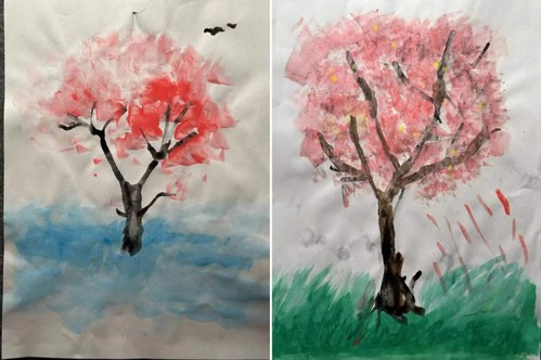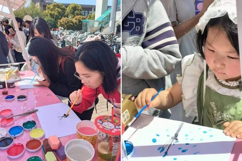 第二个环节“纸上樱花苑”手工制作活动。活动热闹非凡,同学们用吸管将颜料水吹散,在纸上绘制出千姿百态的樱花枝干,随后又用画笔、粉扑、牙刷等工具,精心装点,形成一幅幅永不凋落的“春日樱花图”。同学们的优秀作品在一旁的展板处展出,成为活动展台的独特一角。活动举行期间正值校园开放日,我们迎来了许多特别的朋友,有来自远方的旅人,有对校园生活充满好奇的家长,有许多天真烂漫的小朋友,他们也参与到了我们的活动中,在收获喜悦的同时,也体验到药苑生活的丰富多彩。