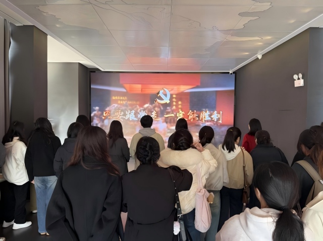 在讲解员的引导下,师生党员们参观“新四军在江宁”专题展馆。馆内详实的图文史料与生动的复原场景,系统再现了新四军在江宁的抗战征程。党员们通过手摇电话聆听《新四军军歌》,在英烈墙前庄重鞠躬,依托互动屏“参与”抗战胜利庆祝大会,沉浸式重温那段艰苦卓绝的红色岁月。