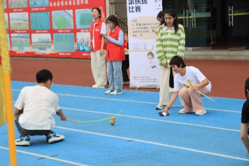 本次运动会设置了踢毽子、抽陀螺滚铁环、纸飞机、跳皮筋花绳、跳房子、投壶、套圈流传广、受欢迎度民俗体育趣味项目,同学们积极参与笑声连连,现场气氛热烈。