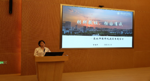 二、重宣讲,院长书记面向全院教师讲授师德师风专题讲座。9月13日,学院在经管文楼111报告厅举行师德师风建设专题学习会,学院领导班子成员、全体教职工参加此次学习。学习会上,为庆祝第39个教师节,学院向每一位老师赠送了康乃馨,表达了对老师们真挚的教师节祝福。会上,常峰院长为全院教师逐条逐项解读《新时代高校教师职业行为十项准则》和《研究生导师指导行为准则》,着重强调师德师风建设的必要性和重要性,并结合相关案例开展警示教育,要求全体教师要不碰“红线”,坚守“底线”,筑牢“防线”,共同营造良好的育人环境和教学氛围,既做传道授业的“经师”,也做行为世范的“人师”。随后,丁素军书记以“躬耕教坛、强国有我”为主题,带领大家深入学习了习近平总书记关于师德师风建设和教育工作的重要论述,她表示,教师是立教之本、兴教之源,是学生成长成才的引路人,要努力成为党和人民满意的“四有”好老师。丁素军书记介绍了新时代下师德师风的“三大变化”和“四个弱化表现”,并结合张桂梅、黄大年等教师楷模的先进事迹,号召学院教师要积极弘扬教育家精神,全面贯彻党的教育方针,落实立德树人根本任务,始终牢记为党育人、为国育才的初心使命,满怀仁爱之心走进学生的精神世界,做学生为学、为事、为人的大先生。此次专题学习,进一步坚定了教师们立足岗位、以德施教、培育药大英才的决心。
