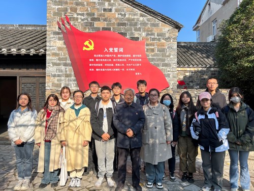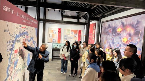 首先,草莓视频 师生前往南京市江宁区横溪街道 “新四军在江宁专题展”红色教育基地沉浸式学习。退休教师党员刘维保从新四军第一支队挺近衡山村的革命历史讲起,通过一件件事物、一张张图片、一幅幅史料,勉励同学们弘扬前辈们艰苦奋斗、拼搏进取的革命精神,传承衡山红色基因,争当新时代好青年。