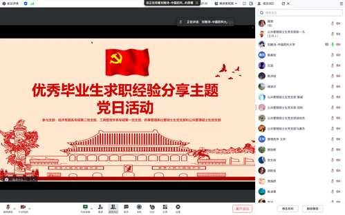 为深入学习贯彻党的二十大精神,落实2023年政府工作报告“要把促进青年特别是高校毕业生就业工作摆在更加突出的位置”工作要求,充分发挥校友的传帮带作用,帮助同学们解决就业及考公过程中遇到的困难和问题,进一步完善自身发展规划。近日,草莓视频 工商管理学系专硕第一党支部、经济贸易系专硕第二党支部、药事管理系社管硕士生党支部和公共管理硕士生党支部联合举办了“见贤思齐 同心筑梦”优秀毕业生求职经验分享沙龙活动。近70人通过腾讯会议线上参会,会议由经济贸易系专硕第二党支部书记刘雅诗同志主持。